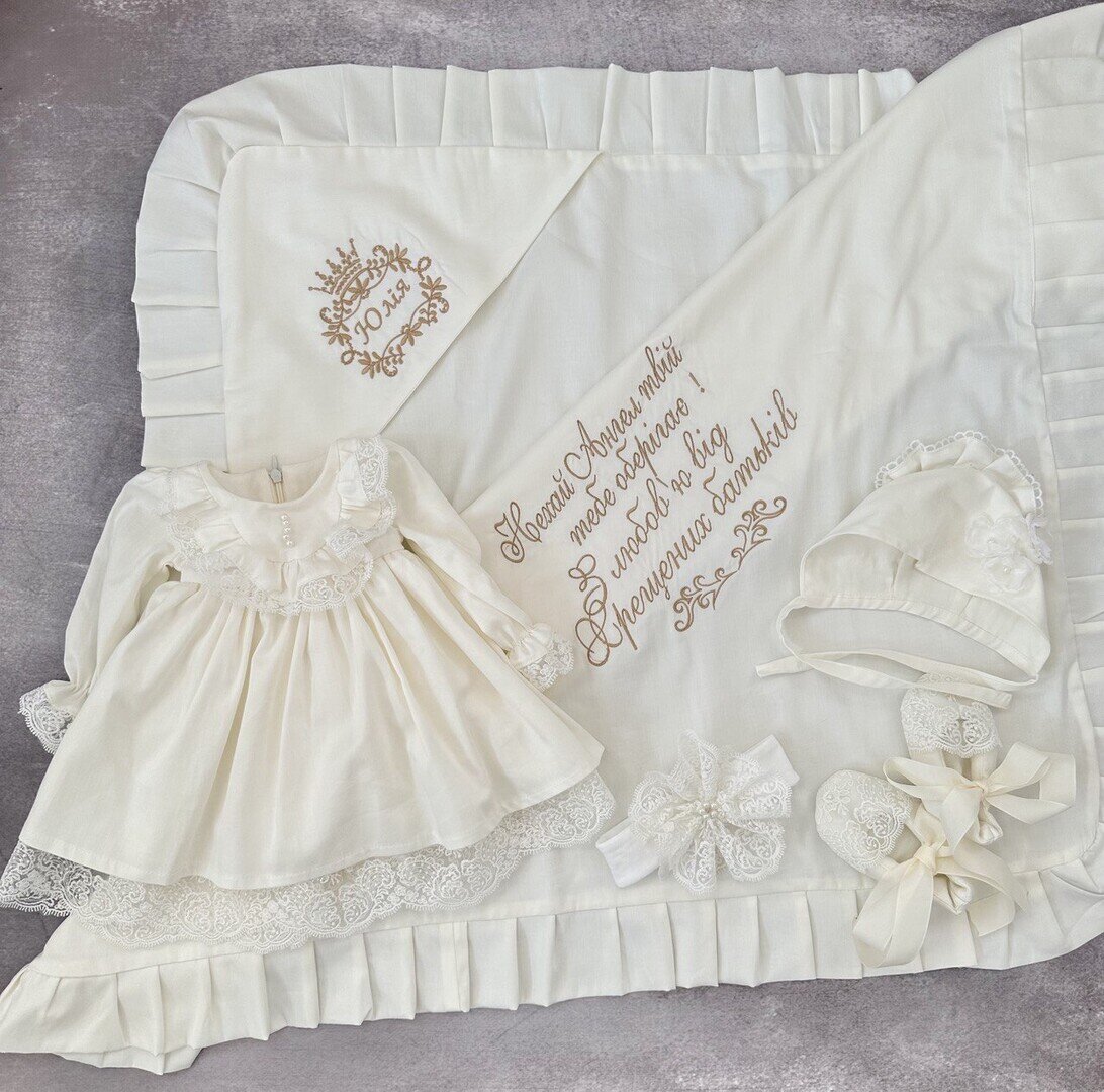 Кожний набір з індувідуальним написом. Ви самі можете вибрати який саме напис необхідно буде додати. Це може бути привітання, ім'я, побажання, що завгодно! До набору входять: крижма на хрещення, плаття на виписку або на хрестини, пінетки, шапочка або повʼязка.