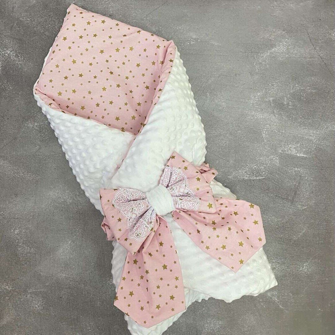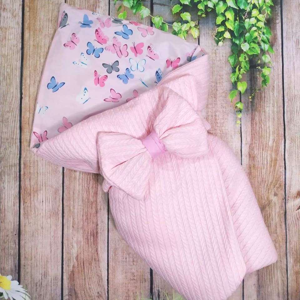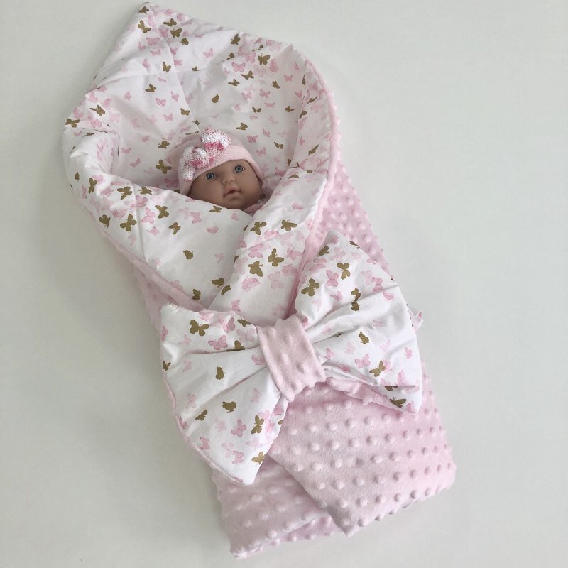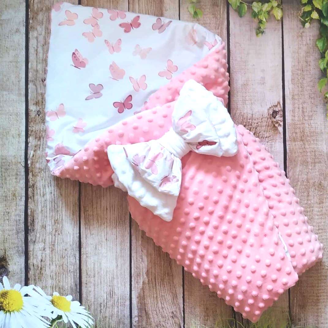 Конверт-плед з плюшу Мінкі з рожевими метеликами гарний набір на виписку з пологового будинку. Для виготовлення використовуються високоякісні тканини фабрик Туреччини. Чудово підійде для хлопчика або дівчинки.