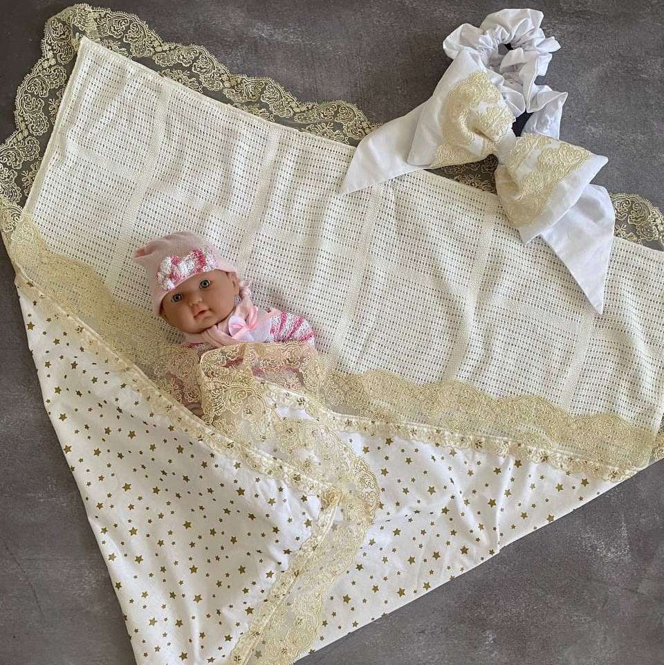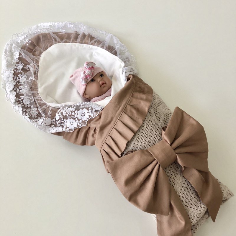 Набір на виписку мереживний куточок та конверт-плед з філейного полотна «Кавовий» гарний набір на виписку з пологового будинку, виготовлений із натуральних тканин зі 100 % бавовни. Для виготовлення використовуються високоякісні тканини фабрик Туреччини. Чудово підійде для хлопчика або дівчинки.