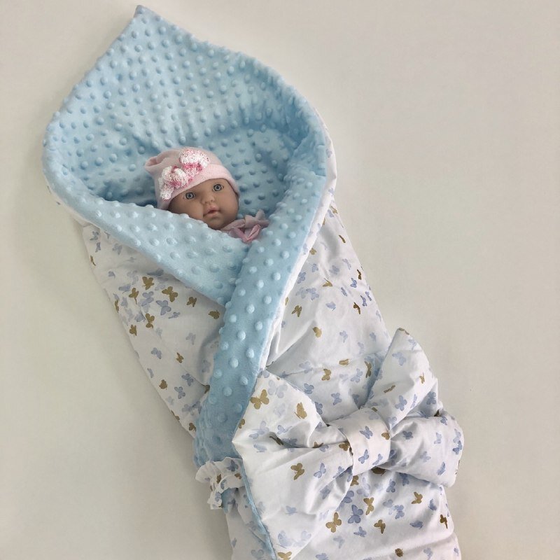 Конверт-плед з плюшу Мінкі з блакитними метеликами гарний набір на виписку з пологового будинку. Для виготовлення використовуються високоякісні тканини фабрик Туреччини. Чудово підійде для хлопчика або дівчинки.