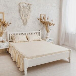 У стандартному розумінні - зазвичай це підодіяльник, простирадло, наволочка. Найчастіше це один підодіяльник, одне простирадло таі дві або більше наволочки. Додатково можна придбати декоративну подушку, обраної Вами колірної гами. При пошитті використовуються білизняні міцні шви, міцні нитки високої якості, декоруємо розкішними вишивками та мереживами. Комплекти натуральної постільної білизни однотонні в наступних колірних рішеннях: біле, синє, сіре, рожеве, оливкове, шампань.