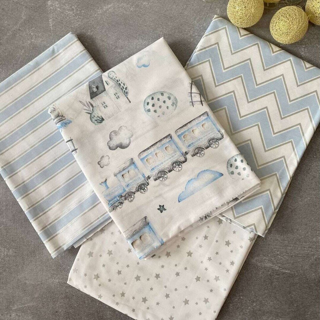 Ранфорс паровозики в блакитному кольорі виробництва Туреччини - натуральна тканина, яка служить для виготовлення домашнього текстилю, переважно дитячих комплектів.