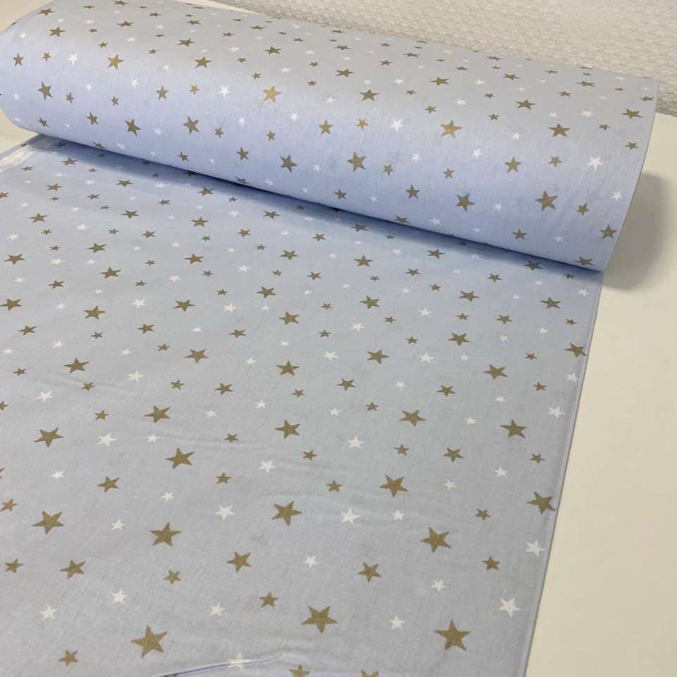 Ранфорс блакитний, зірки золото глітер виробництва Туреччини - натуральна тканина, яка служить для виготовлення домашнього текстилю, переважно дитячих комплектів.