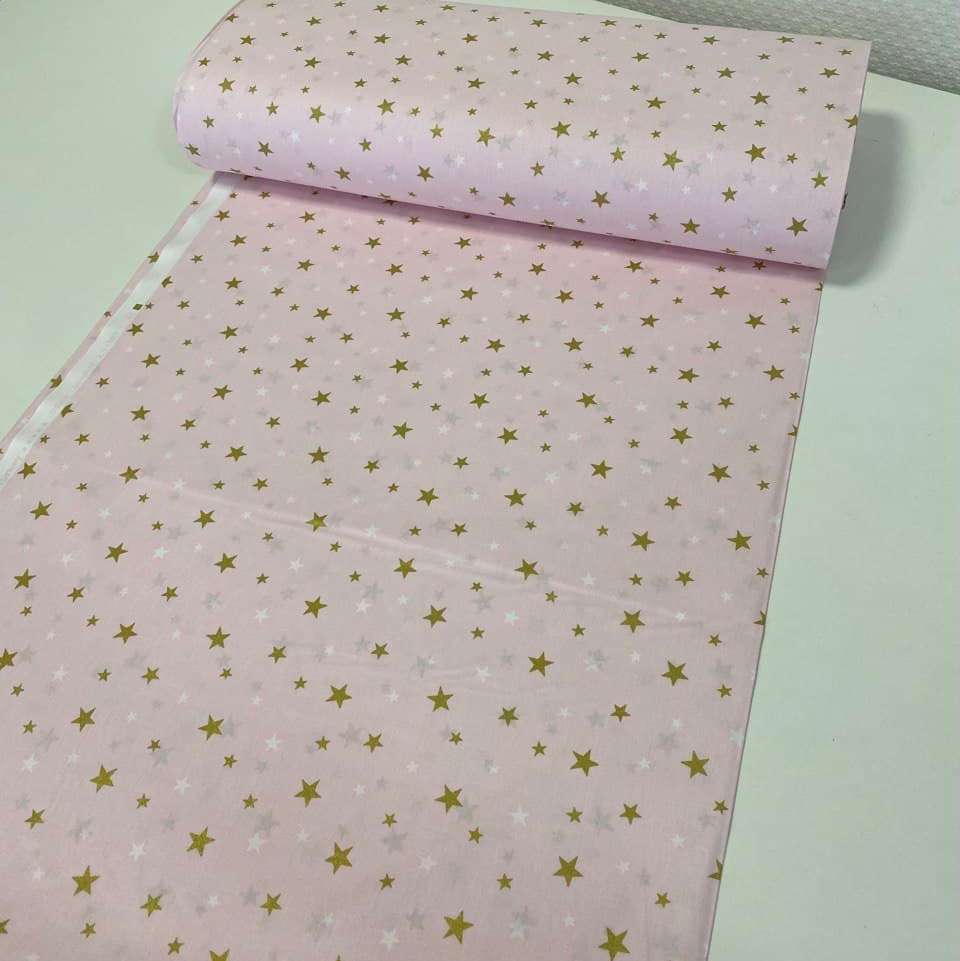Ранфорс рожевий зірки глітер золото виробництва Туреччини - натуральна тканина, яка служить для виготовлення домашнього текстилю, переважно дитячих комплектів.