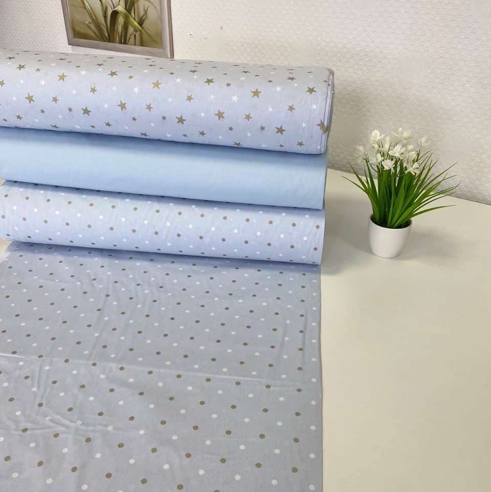Ранфорс блакитний, горох білий та золотий глітер виробництва Туреччини - натуральна тканина, яка служить для виготовлення домашнього текстилю, переважно дитячих комплектів.