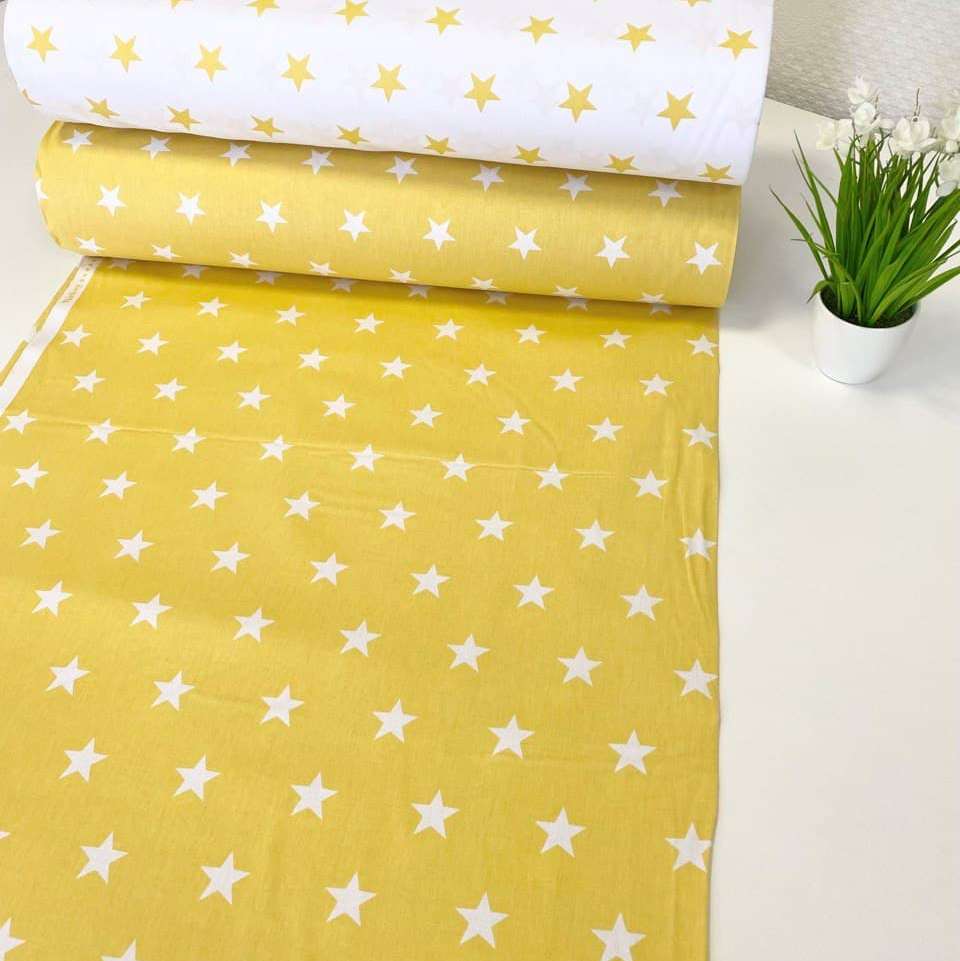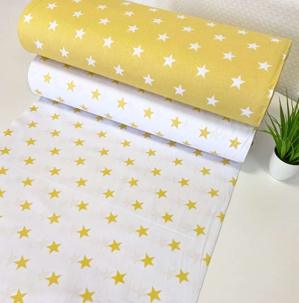 Ранфорс жовтий, зірки білі великі виробництва Туреччини - натуральна тканина, яка служить для виготовлення домашнього текстилю, переважно дитячих комплектів.