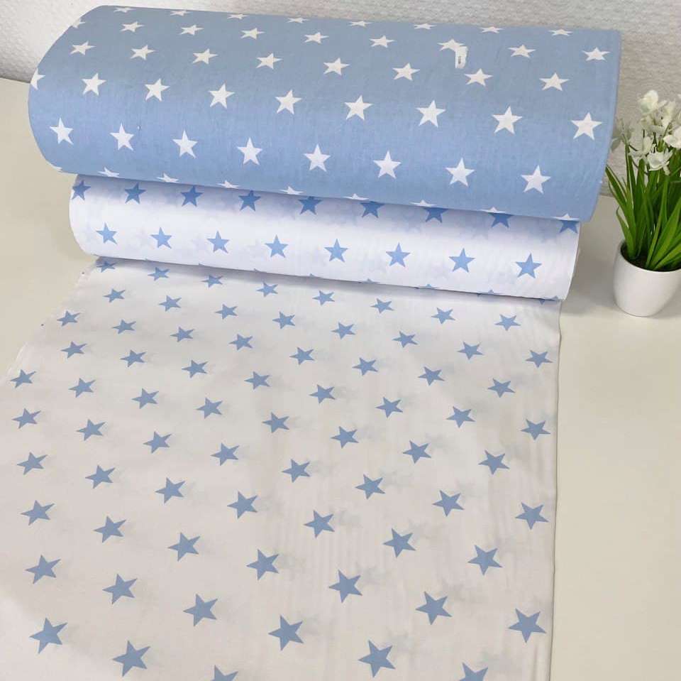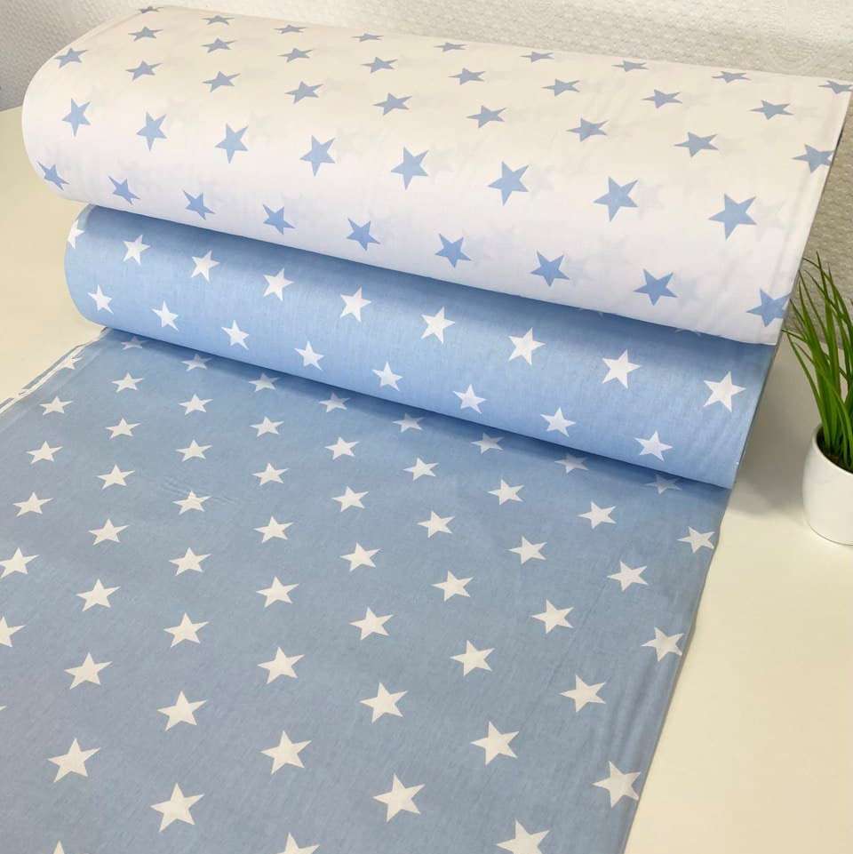 Ранфорс білий, зірки блакитні виробництва Туреччини - натуральна тканина, яка служить для виготовлення домашнього текстилю, переважно дитячих комплектів.