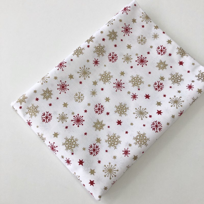Ранфорс червоний зі сніжинками виробництва Туреччини - натуральна тканина, яка служить для виготовлення домашнього текстилю, переважно дитячих комплектів. Чудові новорічні принти для любимих.