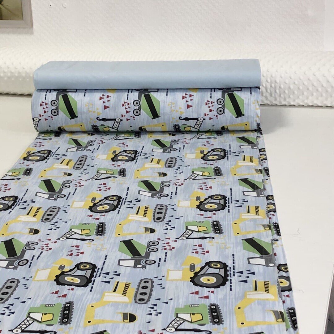 Ранфорс вантажні машинки на блакитному виробництва Туреччини - натуральна тканина, яка служить для виготовлення домашнього текстилю, переважно дитячих комплектів.