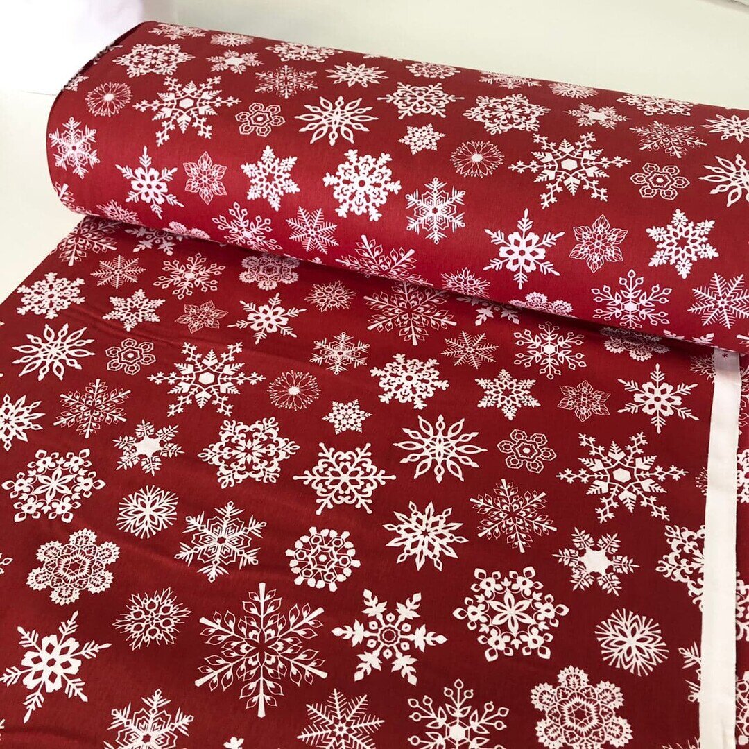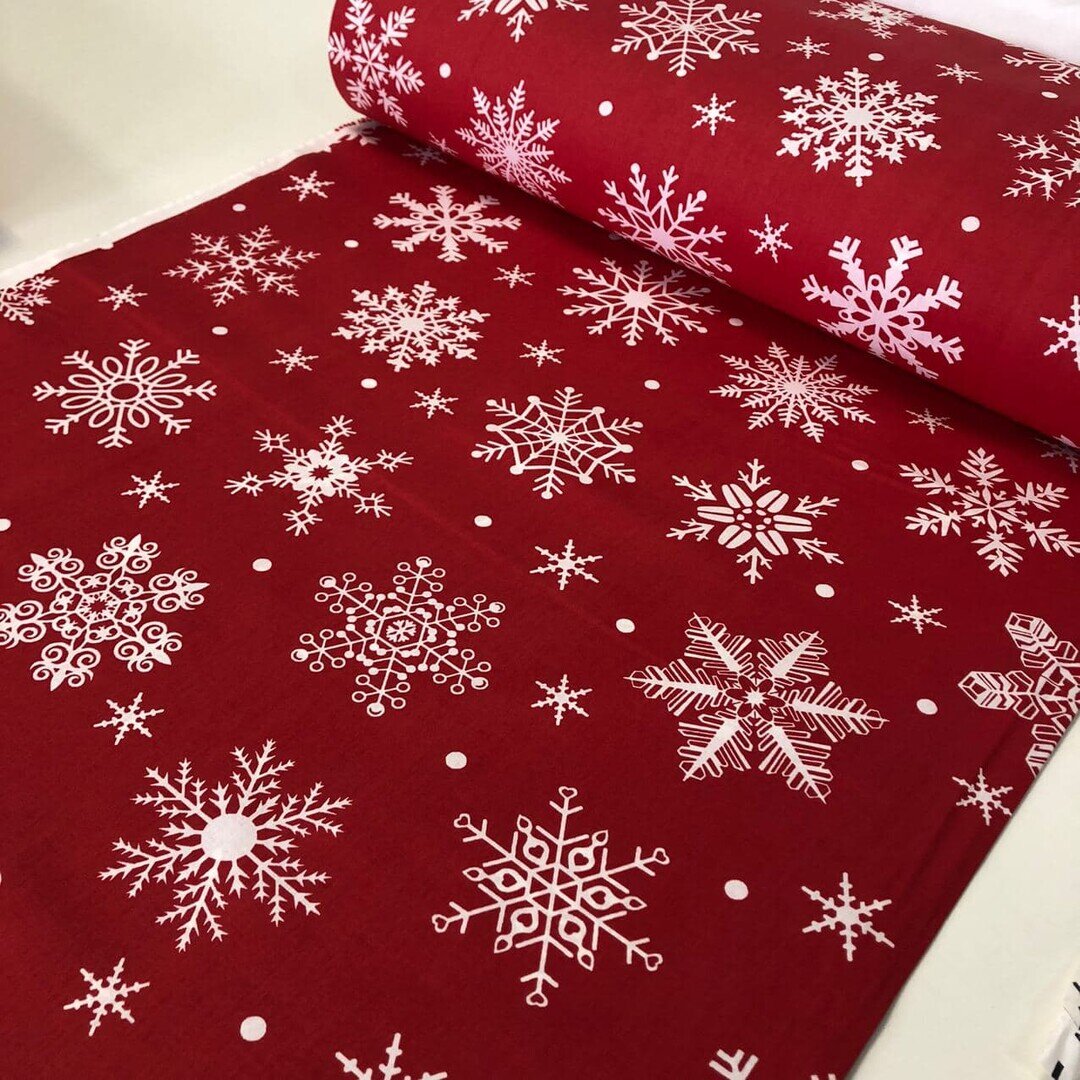 Ранфорс червоний зі сніжинками виробництва Туреччини - натуральна тканина, яка служить для виготовлення домашнього текстилю, переважно дитячих комплектів. Чудові новорічні принти для любимих.