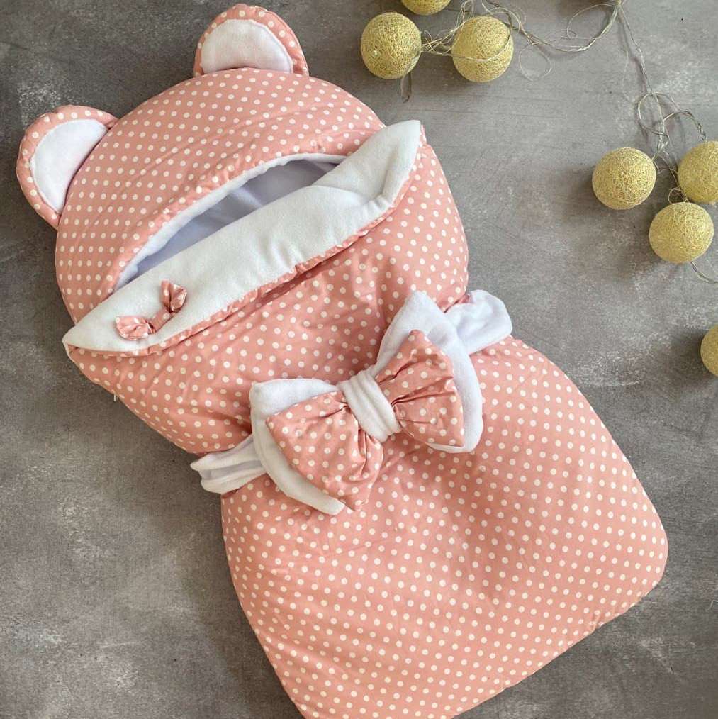 Конверт спальник на блискавках пудра в горох + бант на гумці гарний набір на виписку з пологового будинку. Для виготовлення використовуються високоякісні тканини фабрик Туреччини. Чудово підійде для хлопчика або дівчинки.