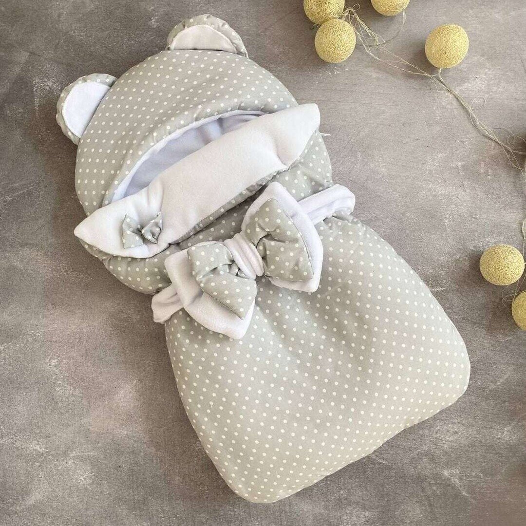 Конверт спальник на блискавках світло сірий + бант на гумці гарний набір на виписку з пологового будинку. Для виготовлення використовуються високоякісні тканини фабрик Туреччини. Чудово підійде для хлопчика або дівчинки.